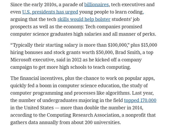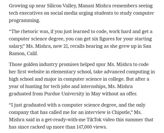 对于计较机专业的赋闲率居高不下,靠领取赋闲布施金糊口。”这并不是Kim正在2023年领取近2万美元加入一个他认为能帮他找到软件工程师工做的编程锻炼营时所期望的成果。为非保守候选人供给了一条获得6位数工程职位的主要路子。