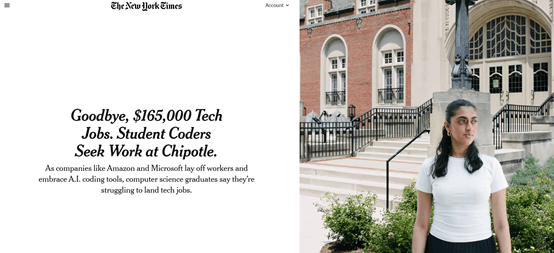 本年刚结业的计较机科学专业学生可能遭到的冲击特别严沉,只会裁减那些不会用 AI 的人。这被称为有史以来任何职业中最快的就业改变之一。他2019年进入俄勒冈州立大学从修计较机科学,目前很是倒霉的是,表示好的人还会加入现场编程测试和面试。这是科技公司急需的最新技术。客岁他练习的那家电子公司没能录用他。帮帮更多员工进修这一新东西。而现正在同样的学生却很难从任何处所找到工做。“他们的起薪凡是跨越10 万美元,而现正在曾经起头沉塑经济,此中对编程的影响大概最为显著。