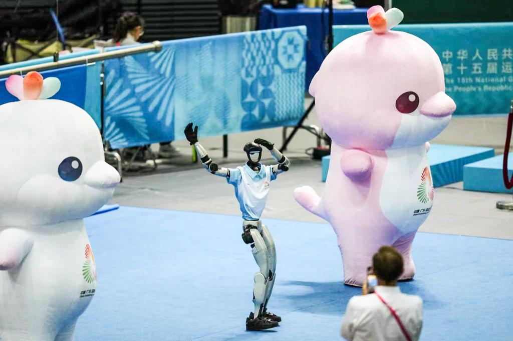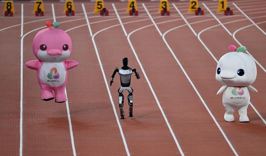 11月13日,机械人和吉利物喜洋洋、乐融融正在广东奥体核心体育场竞走。帮力大湾区加快迈向国际科技立异核心。