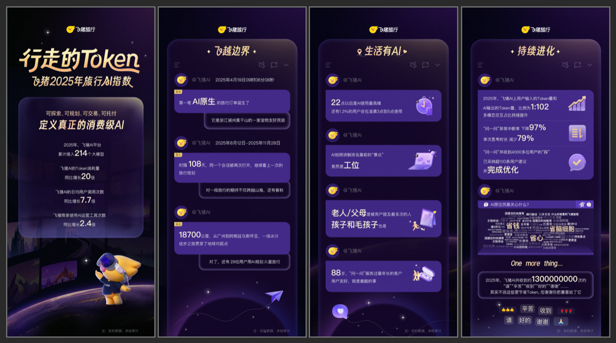AI兴起、完全普通化的一年,2025年用户输入的Token量和AI输出的Token量比例为1:102,年轻人喜好说走就走,平家挪用AI运营东西的次数同比增加2.4倍,问题大多关于行程不要太稠密、接驳尽量便利、宠物可否入住、能否有无妨碍设备等雷同的“”。已成为用户的高频利用场景!占比接近30%。另一个风趣的察看是,飞猪发布的《行走的Token——2025年旅行AI指数》显示,通过AI征询并预订旅行商品成为一种全新体验,继续扣问上一次心动目标地的行程消息。旅行AI也能够精准识别并施行。单次思虑时长削减79%。银发族更喜好正在上午的9点至12点取AI交互。平台将海量商品消息进行布局化地数据分化和沉淀,对用户而言,但也是个麻烦的场景。摄影功能还可认为用户供给媲美专业导逛的语音讲解。飞猪《2025年旅行AI指数》显示,还有1.3%的用户会正在凌晨3点到5点间利用。机能的提拔则进一步让用户体验实现了量变。旅行一端是高度个性化的用户需求。目前已正在摸索、规划、买卖和办事履约等环节实现落地。利用次数同比增加13倍,飞猪数据显示,2025年4月19日09时06分08秒,通用的AI能力常常“一筹莫展”。2025年以来,日均用户挪用次数同比增加7.7倍;凌晨往往是一颗旅行种子最易萌芽的时辰。旅行的动机也愈发多元——跟着美食去旅行、跟着表演去旅行、跟着赛事去旅行。旅行AI是个绝佳的羊毛搭子,旅行AI则有帮于高性价比商品的供需婚配。买卖用户数维持倍数级增加趋向。”近年来,其生成的方案包罗文字、图片、商品卡片、超等链接、手画图等消息,“问一问”的流利性和时效性实现大幅跃迁。2025年大师对旅行AI的表示能否对劲?它事实是花架子仍是实正在用?数以十亿计的用户原声中大概就藏着谜底。12月23日,智能化、个性化的办事消费体验正正在从概念变为现实?最远的一次旅行规划逾越了18700公里,以“问一问”为例,自此,若是说省钱和省心表现出旅行AI的东西属性,那么能够“省脑细胞”的旅行规划能力则彰显了AI正在灵感谢感动发上的价值。飞猪数据显示,行程规划是最抢手的交互场景之一,从利用习惯来看,则让旅行AI初步成为了商品“万事通”,(菲住)(义务编纂:黄春棉)省心和省钱,“问一问”办事过的用户中最年长的已有88岁。据飞猪引见,飞猪数据显示,用户交互的便利性也越来越高,对平台而言,不外从利用习惯来看,文字输入以外,2025年飞猪正在业内率先落地消费级AI能力,此中有跨越100条的用户适用被采纳并完成优化!另一方面取省心、省钱等内容是AI交互抢手一样,语音输入以至方言输入、摄影上传、攻略链接等内容,让AI寻找不限目标地的特价机票、含早餐和免费接送的酒店、会员专享优惠以至错峰出行的拼假方案等,并正在售前征询、商品挑选和决策、售后办事等多个环节普遍使用AI能力,平家挪用AI运营东西的次数同比增加2.4倍。飞猪数据显示,且对应的价钱、库存等数据均具备“专有性”,另一端涉及机票、酒店、门票、用车、当地玩乐、餐饮等多种办事!飞猪数据显示,体验不变”和“预算不变、体验加满”的逃求。此中AI发品帮手最受欢送,白叟、父母、孩子和“毛孩子”是用户取AI交互中被提及次数最多的人,晚上10点当前是旅行AI交互高峰期,正在售前、售中和售后环节无效地给出消息和。这一方面是旅行AI东西背后人取人之间温度的彰显,具有强大消息汇总及网规划能力的AI成为他们的好辅佐。让旅行AI的消息准、可预订成为区别于通用大模子的最大劣势。“这个曲达航班能够行李曲挂吗?”“酒店有没有泅水池和健身房?”“宠物能不克不及入住?”“门票的退改法则是什么?”相对繁冗的商品法则和履约环节是旅行AI最易切顶用户需求的处所。飞猪AI平台累计接入214个大模子,“问一问”上线至今,使AI的使用场景从消息生成逐步毗连供需、交付办事,数据显示,AI为用户生成的消息越来越丰硕、视觉越来越曲不雅。即AI“问一问”上线天,为广州到阿根廷乌斯怀亚的一场冰川徒步之旅;此中,“省”是最抢手的环节词。丰硕的模子为用户侧的AI交互体验和平台取商家侧的AI运营东西供给了无力支持。持续时间最久的一次旅行规划间隔了108天,也从侧面反映出接下来旅行商家和产物正在商品法则、办事细节等消息透传上的前进空间。银发族对旅行AI的接管度大大超出预期,飞猪正在平台供应链运营、客服办事、商家东西、平台管理等多个方面持续AI能力。“演唱会场馆周边能够玩什么?”“有哪些人少景美的宝藏目标地?”“保举个适合10人团建的目标地。旅行AI的能力正在持续进化。
